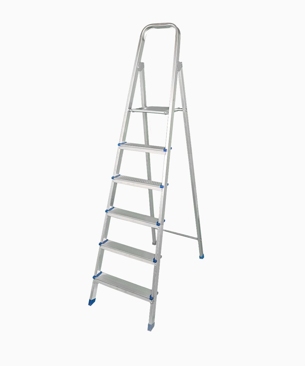 Σκάλα αλουμινίου οικιακής χρήσης με φαρδύ πλατύσκαλο και εργονομική προστατευτική καμπύλη για μεγαλύτερη άνεση και ασφάλεια. Διαθέτει ανάγλυφα (διαγραμμισμένα) σκαλοπάτια αλουμινίου με διπλή πριτσίνωση για σταθερότητα κατά την ανάβαση και την κατάβαση. Από το μοντέλο με 6 σκαλοπάτια και άνω, ενισχύεται με ιμάντα ασφαλείας για μέγιστη προστασία και ασφάλεια.